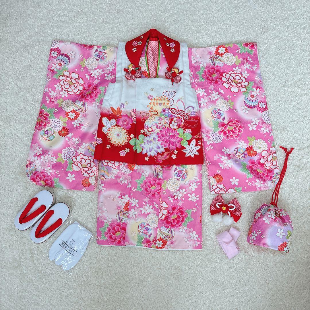 在庫処分 半額 女の子 フルセット 正絹 3歳 着物 七五三 七五三 着物 正絹 アンティーク レトロ ピンク7歳 日本髪 結び帯 フルセット 友禅 被布 絵羽柄の着物 七五三